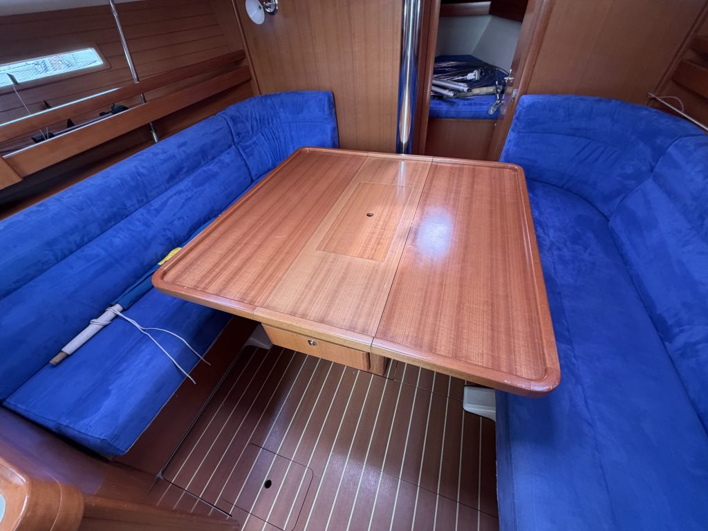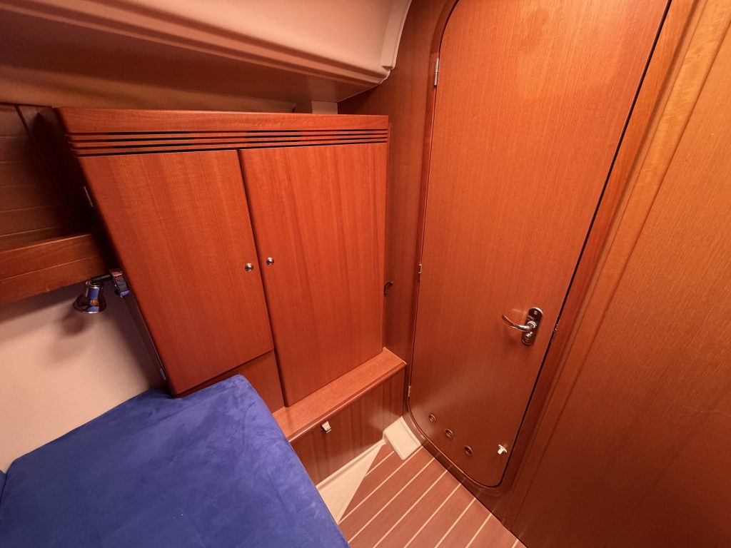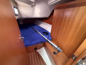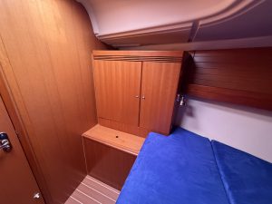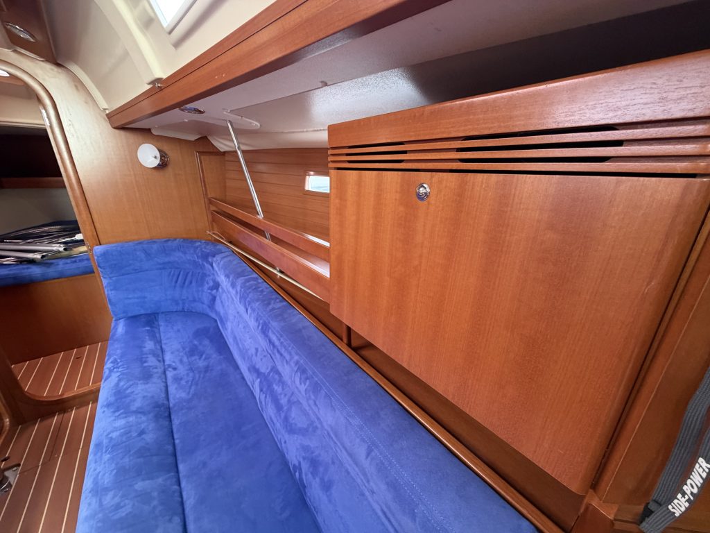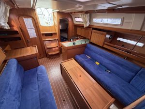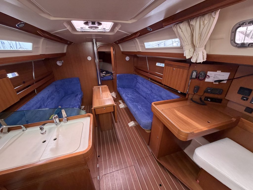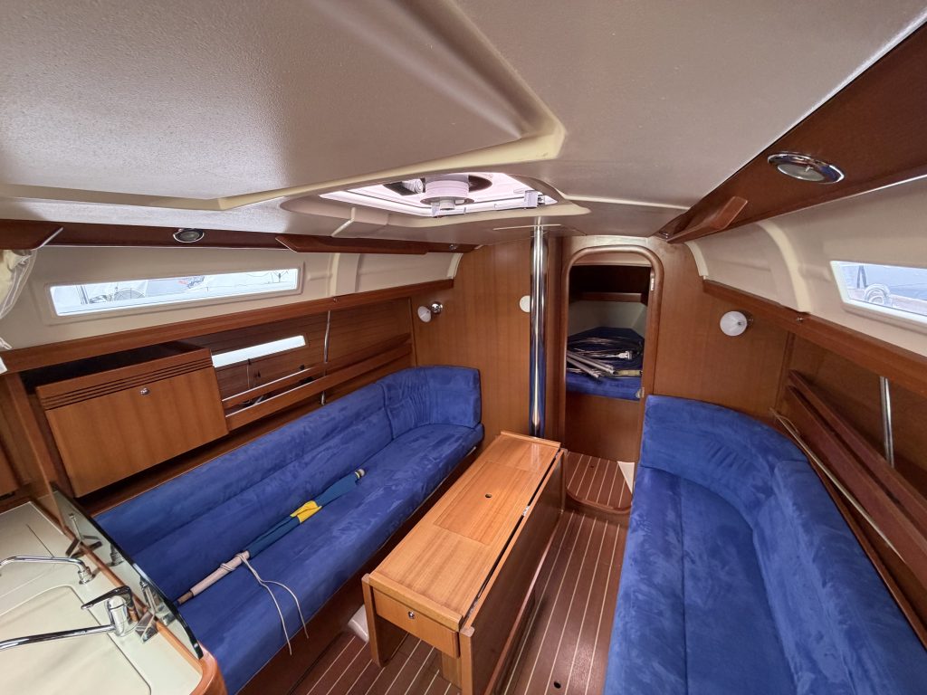 Detta ex är 2-kabins versionen med två stora kabiner med dubbelkoj och gott om förvaring. I salongen återfinns pentry med all utrusning man kan förvänta sig. Mitt emot finns WC/Dusch samt kartbord. Den trivsamma salongen med två längsgående soffor med bord rymmer en hel besättning så väl till middag som samkväm. Genomgående fin träinredning som ger en ombonad och mysig atmosfär. Båten har även bra med förvaring.