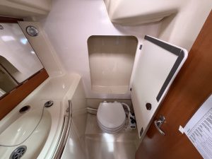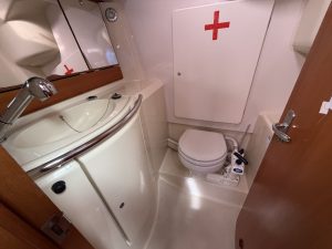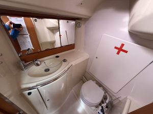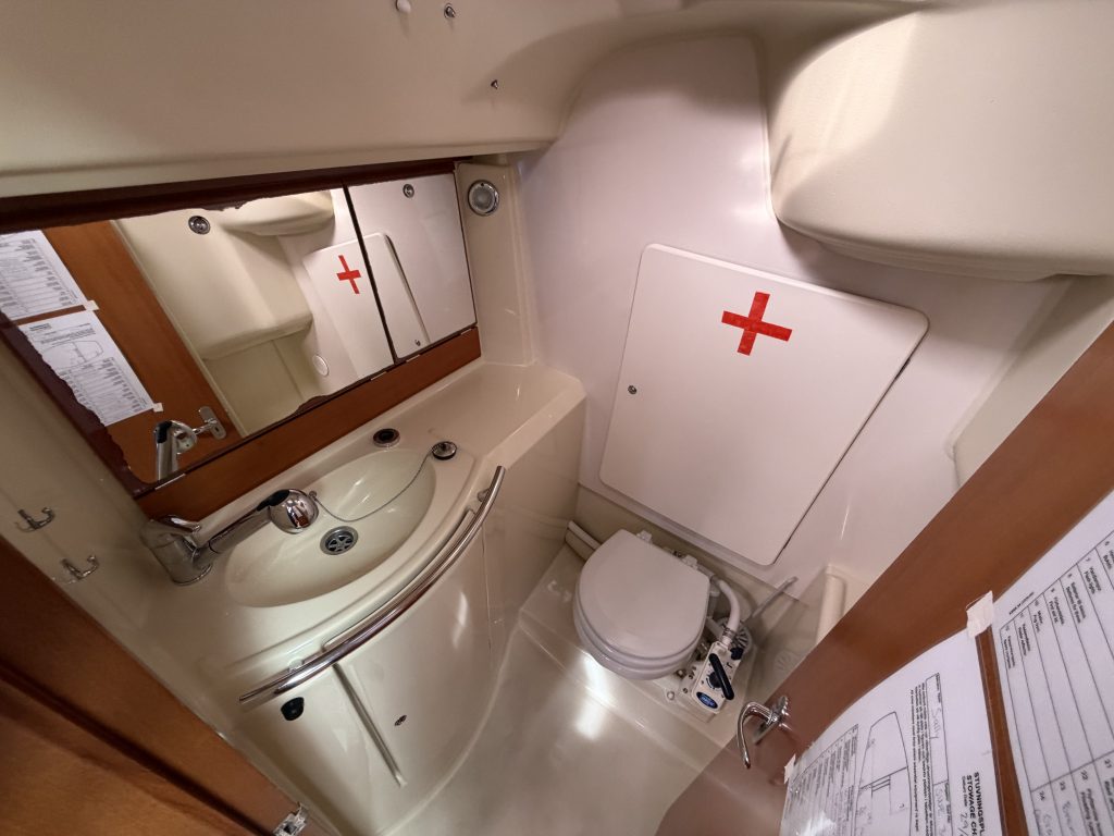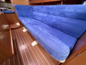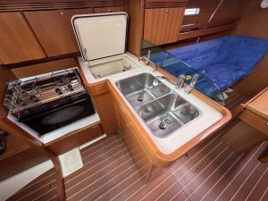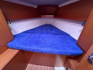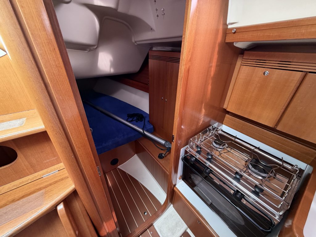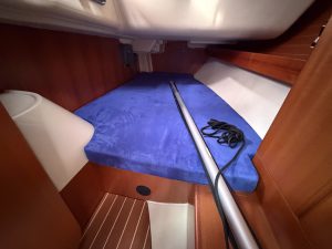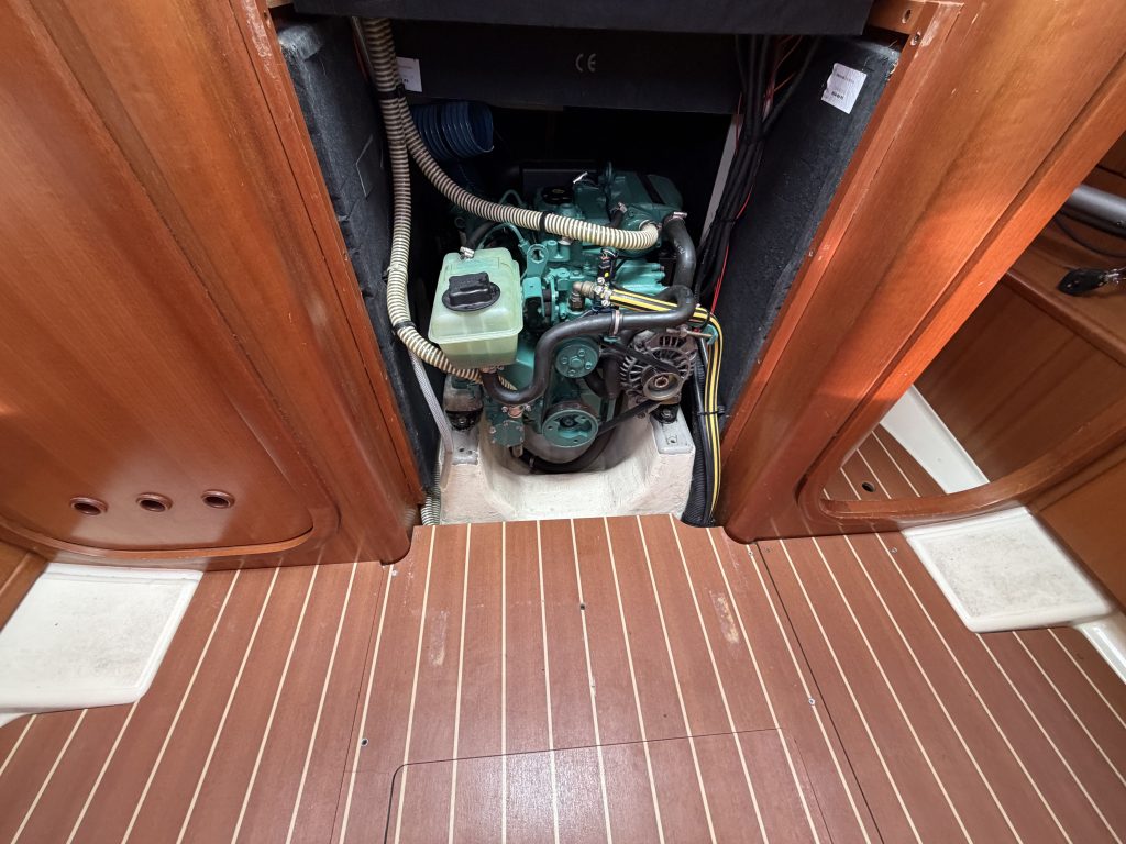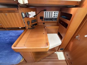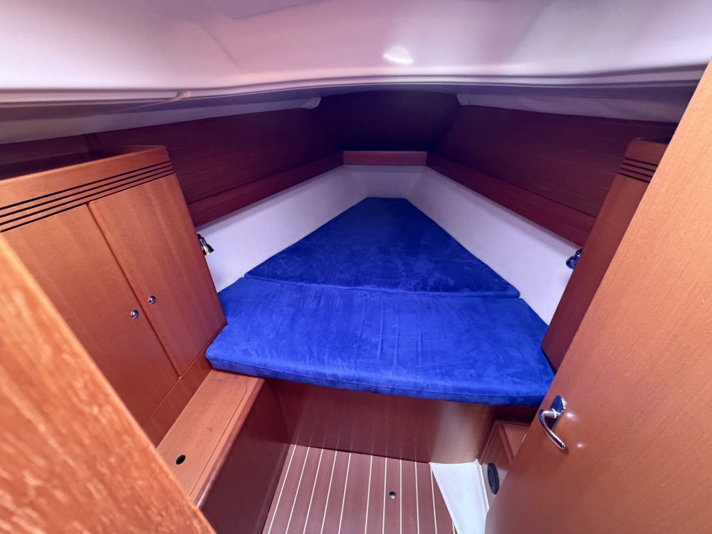 Detta ex är 2-kabins versionen med två stora kabiner med dubbelkoj och gott om förvaring. I salongen återfinns pentry med all utrusning man kan förvänta sig. Mitt emot finns WC/Dusch samt kartbord. Den trivsamma salongen med två längsgående soffor med bord rymmer en hel besättning så väl till middag som samkväm. Genomgående fin träinredning som ger en ombonad och mysig atmosfär. Båten har även bra med förvaring.