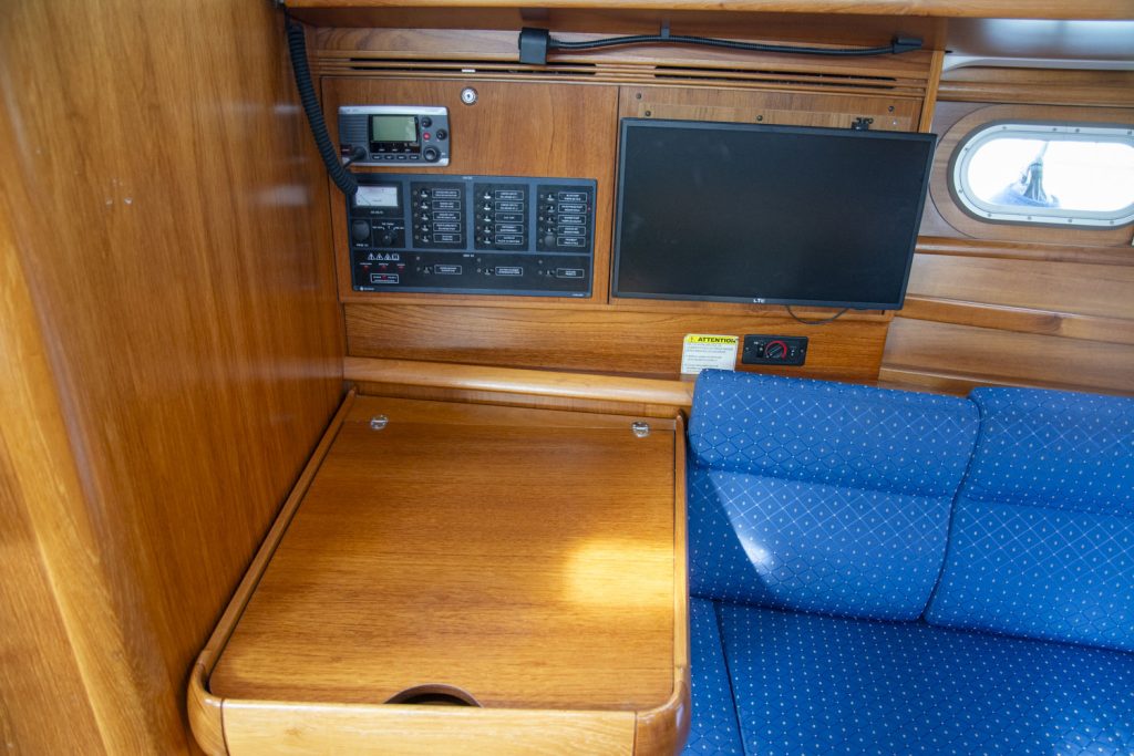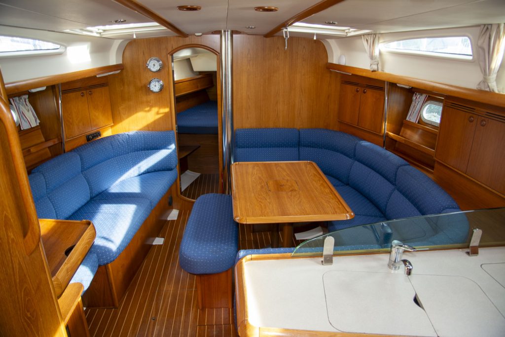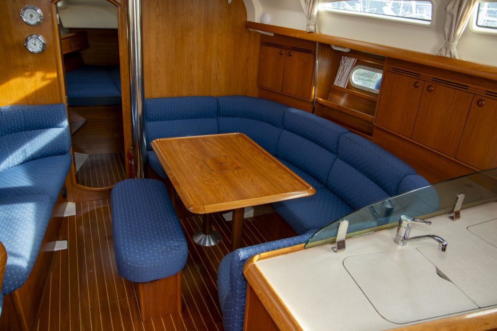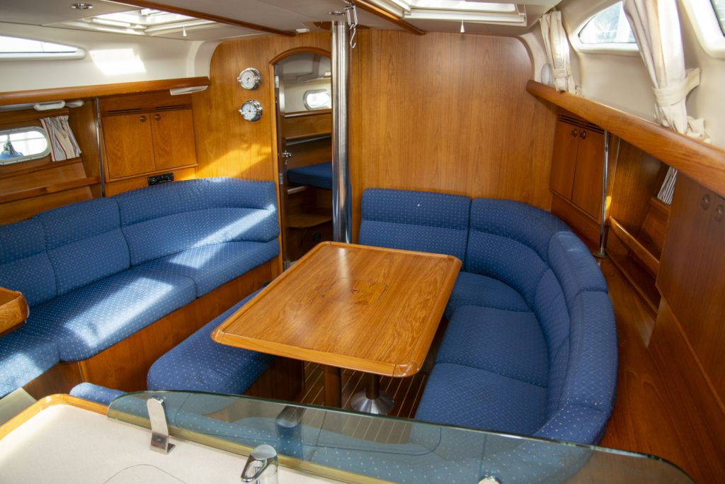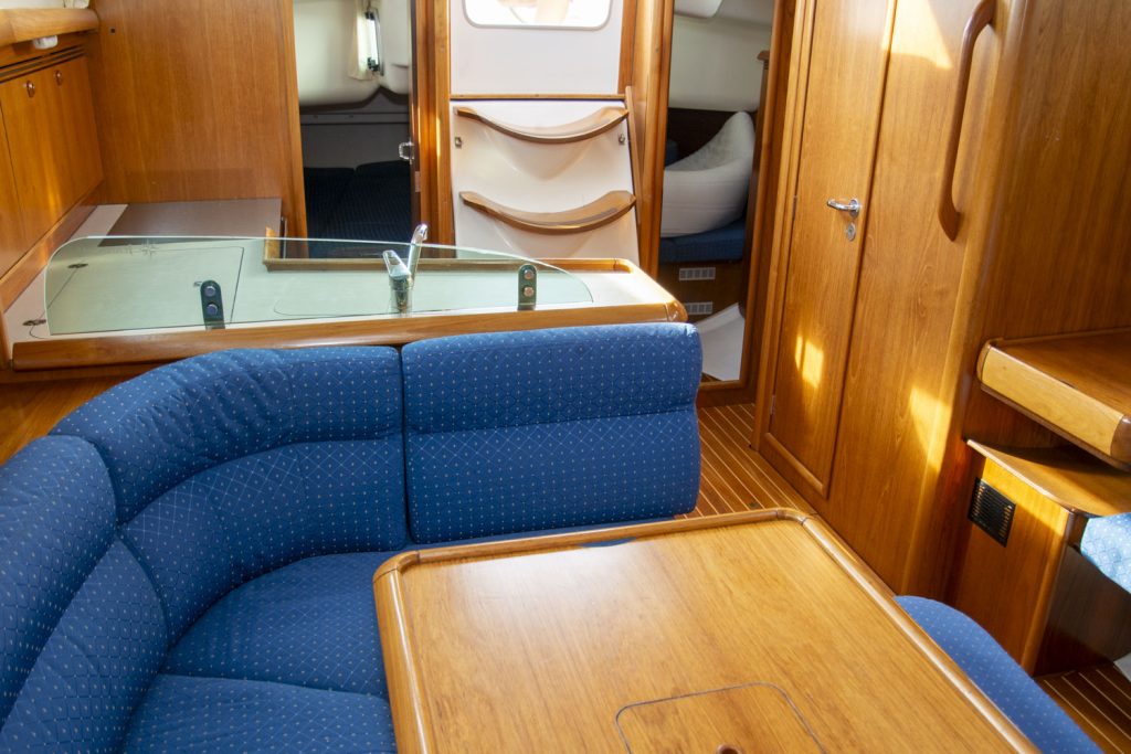 Längs babordssidan är ytterligare en soffa framför navigationsbordet. Navigationsbordet går på ”Jeanneau-vis” att skjuta bak så att soffan blir längre. I detta läge blir navigationsbordet ett smart side-board.