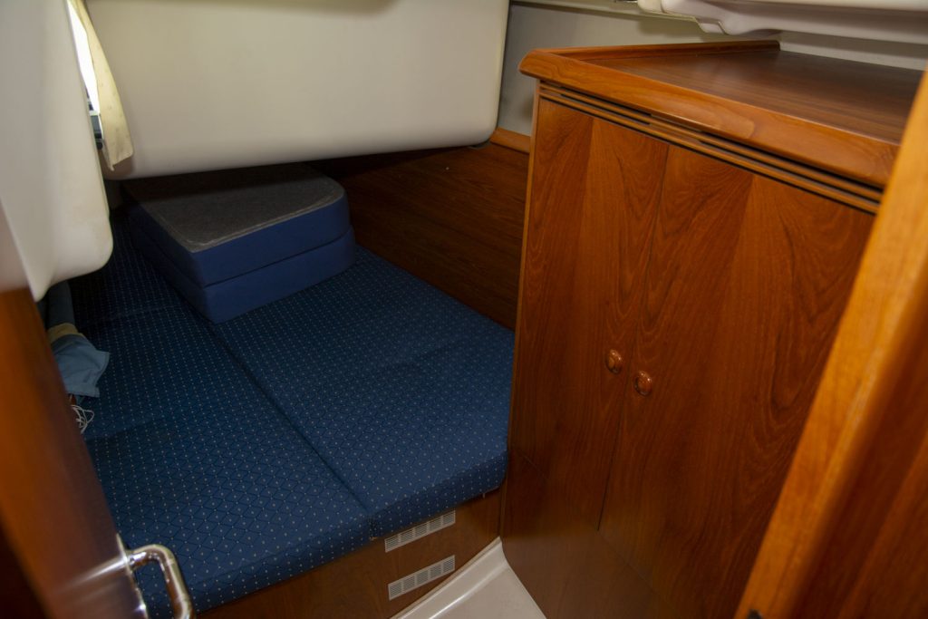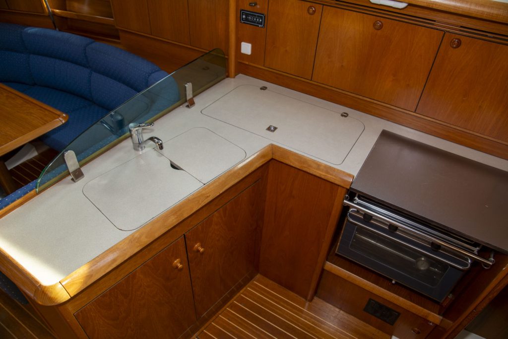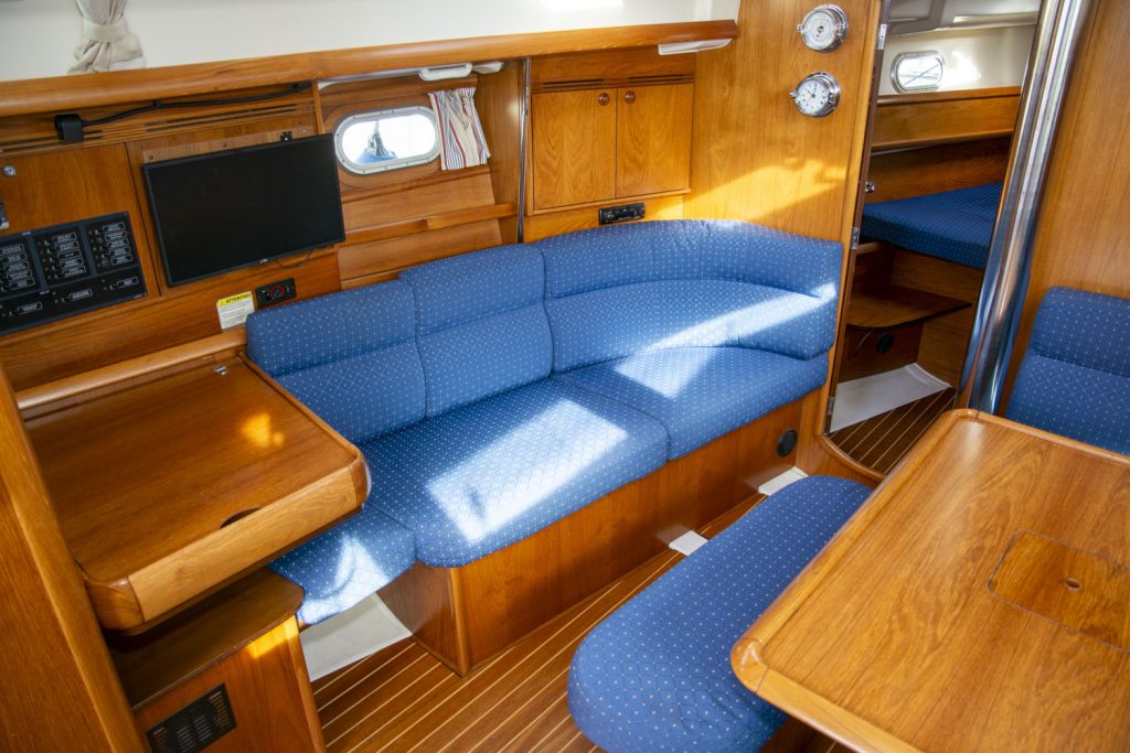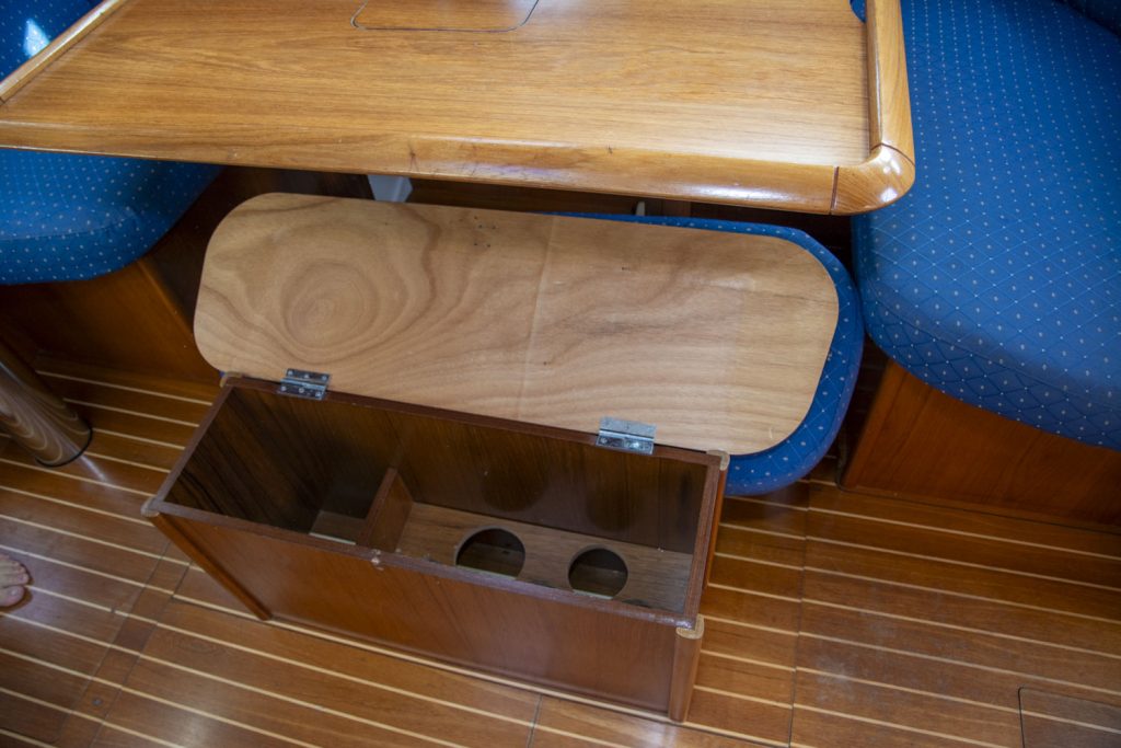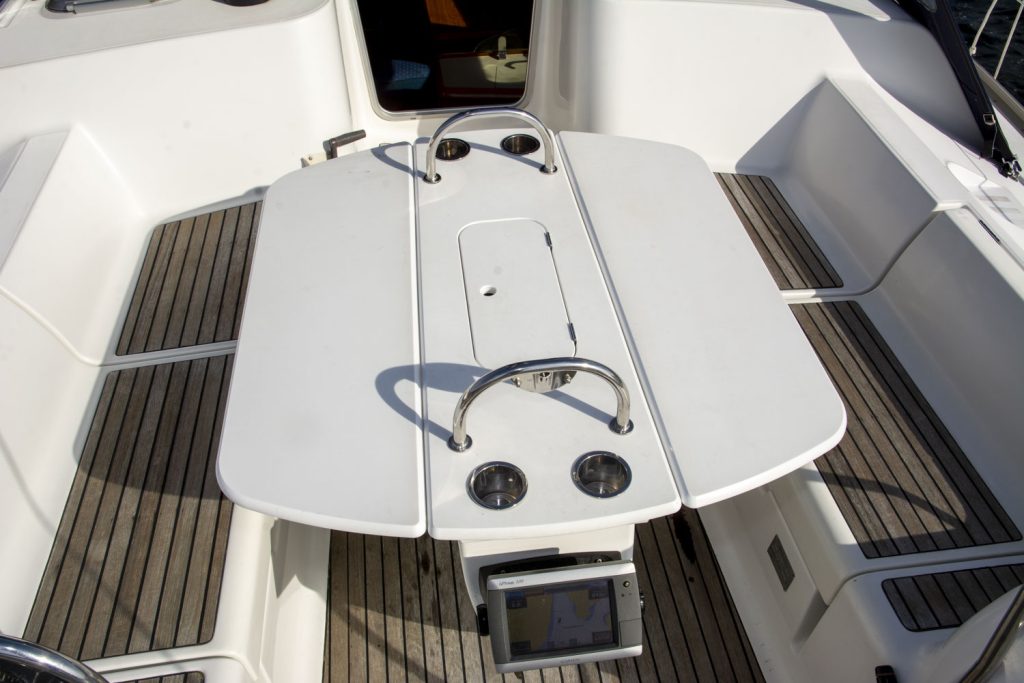 Längs babordssidan är ytterligare en soffa framför navigationsbordet. Navigationsbordet går på ”Jeanneau-vis” att skjuta bak så att soffan blir längre. I detta läge blir navigationsbordet ett smart side-board.