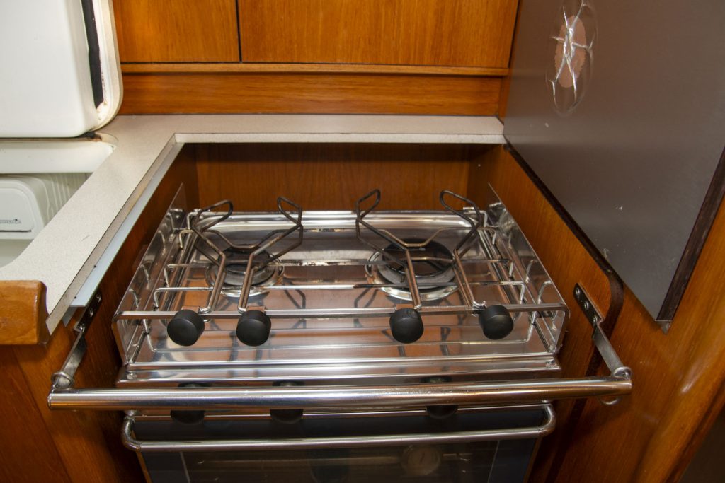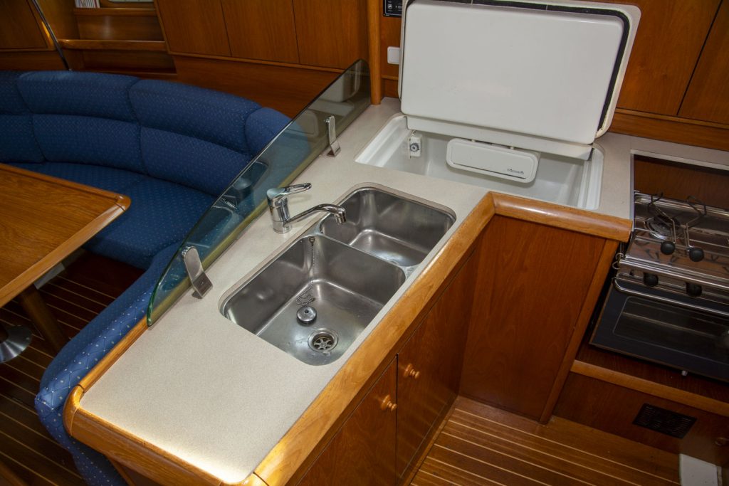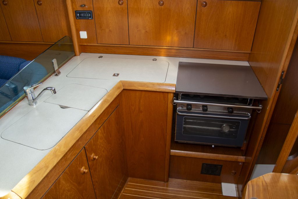 Vid nedgången finns framåtriktat, rymligt pentry på styrbordssidan med tvålågig spis med ugn samt ett mkt stort, 140 l, välinrett kylbox. Bakom pentryt är ingången till ena den rymliga akterhytten. På babordssidan vid nedgången finns toaletten den stora toaletten. Bakom denna ligger den andra rymliga akterhytten.