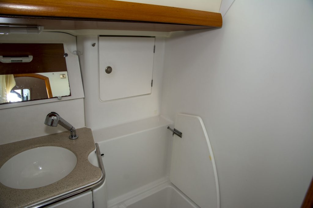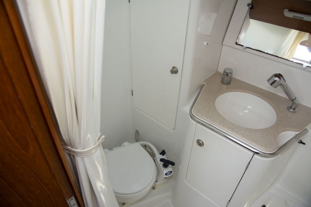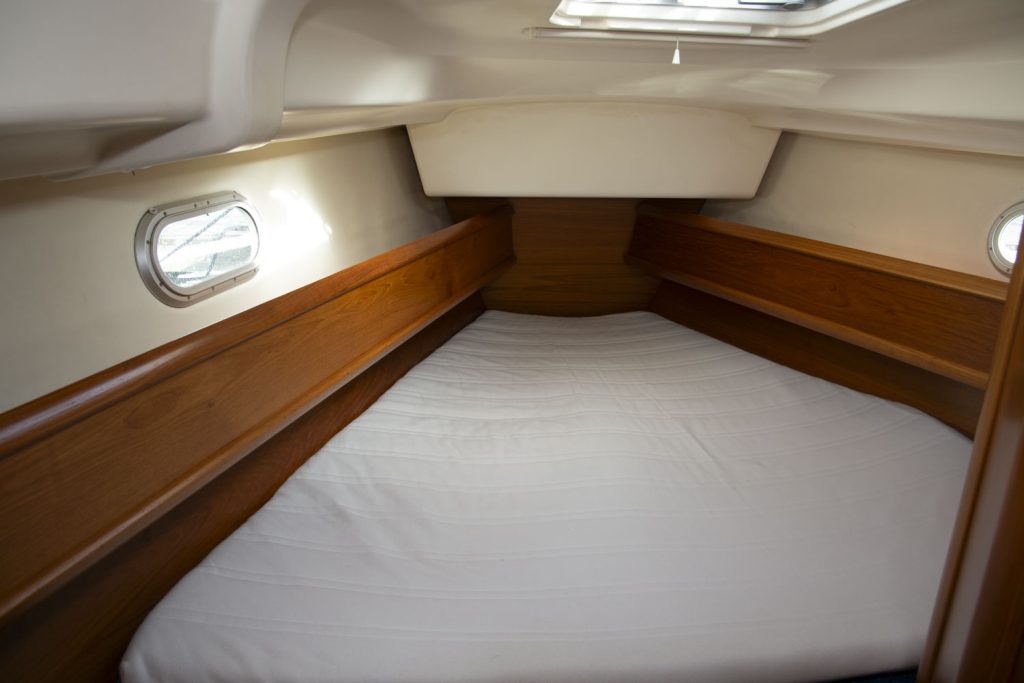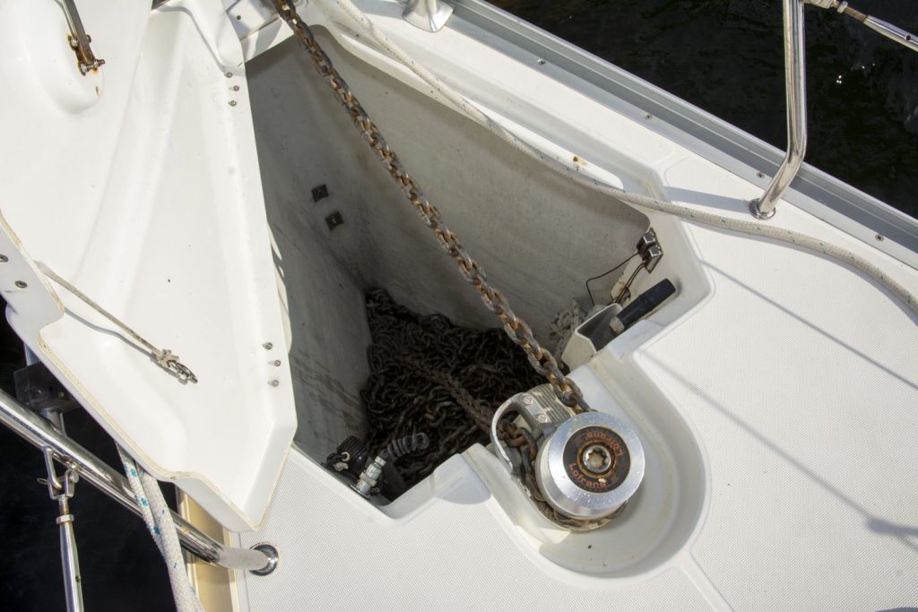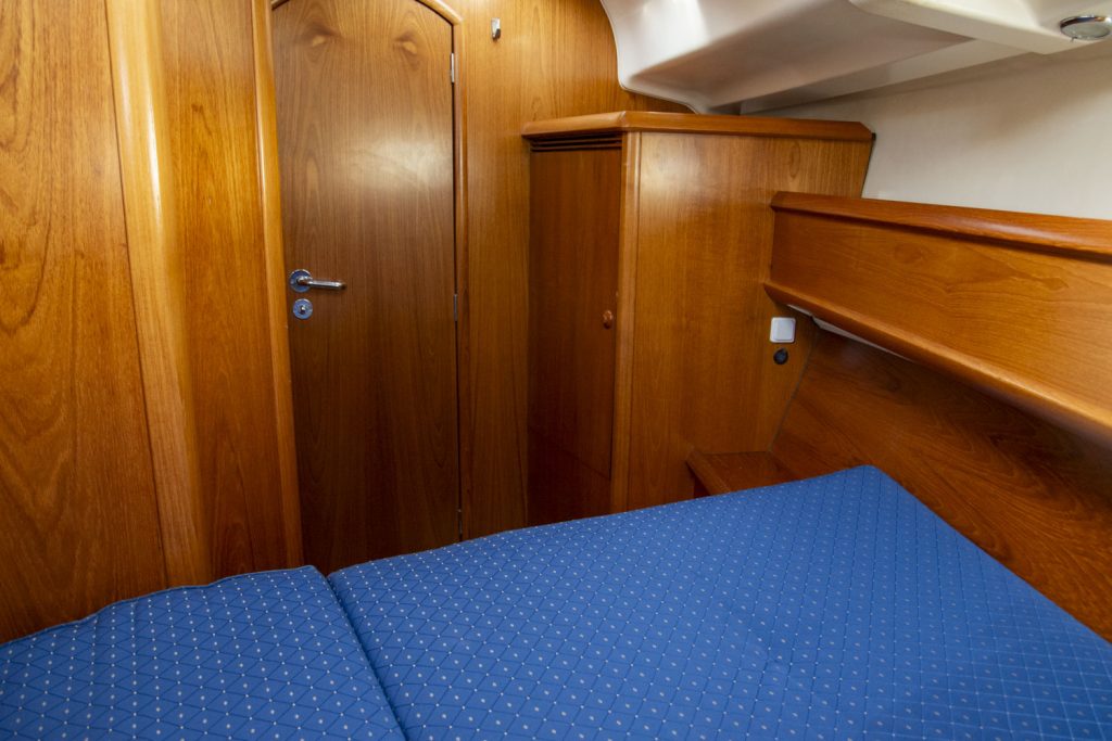 I fören har denna båt ägarhytten med en stor centrumbädd samt en ståhöjd på 187 cm. Här finns också den främre toaletten. Förlig och akterlig toalett har däcktömning. Båten har en utrustningsnivå som uppfyller alla behov. Allt från ett stor Lithium batteribank, ankarspel i för och akter, bogpropeller, fina segel och kapell samt dusch. Läs igenom den kompletta utrustningslistan, pdf.