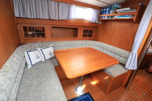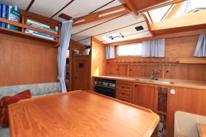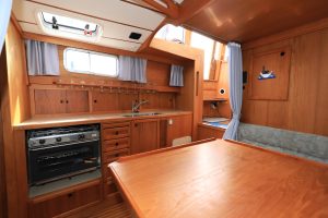 Fra styrehuset er der nedgang til kabyssen, hvor der også er spiseplads til besætningen. Herfra og videre frem i skibet er der først et toilet forberedt for brus og også adgang til forkahytten med to køjer. Spisepladsen kan omdannes til en dobbeltkøje.