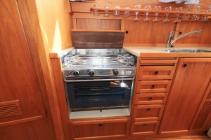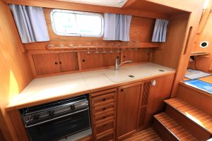 Kabyssen er indrettet med komfur med to gasblus og ovn. Der er køleskab med kompressor og naturligvis koldt og varmt vand.