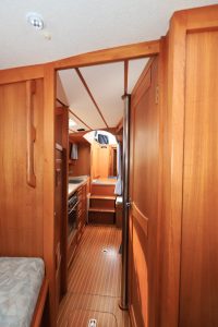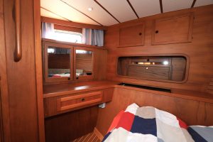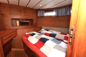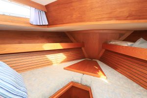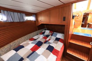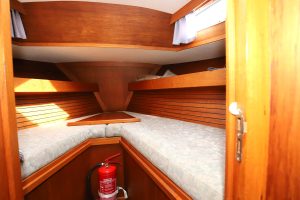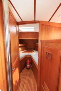 Går man fra styrehuset og agterud er der en kahyt med dobbeltkøje og også adgang til det andet toilet, der ligeledes er forberedt for brus.