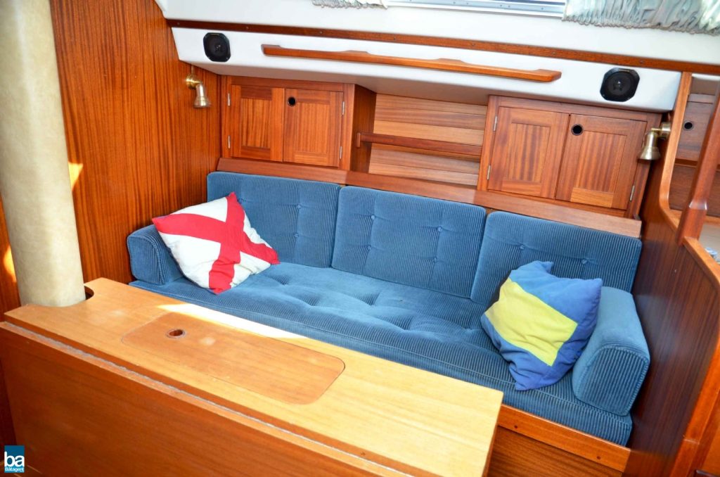 Om styrbord ligger ett L-pentry med dubbla hoar, spis med ugn, kyl och bra förvaring. Om babord har vi ett navigationsbord och ingång till en mycket trivsam aktre hytt. Bra förvaring och en lyxig koj. Salongen rymmer en hel besättning och har bra förvaring och hyllor. Förut återfinns en fin toalett och ingång till förpiken. Två rejäla garderober med hyllor på babord sida och den praktiskt placerade toaletten om styrbord. Förpiken har två fullängdskojer.